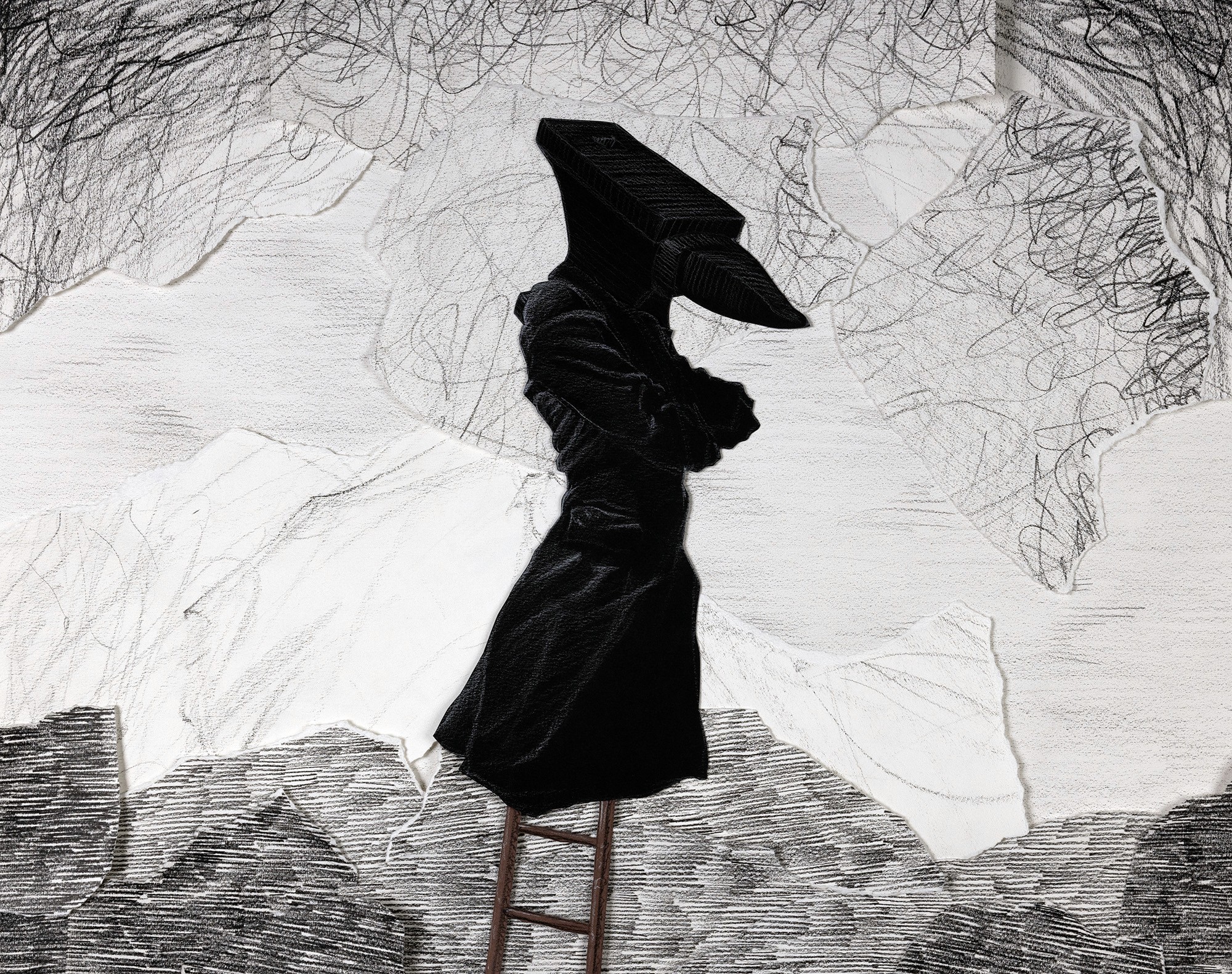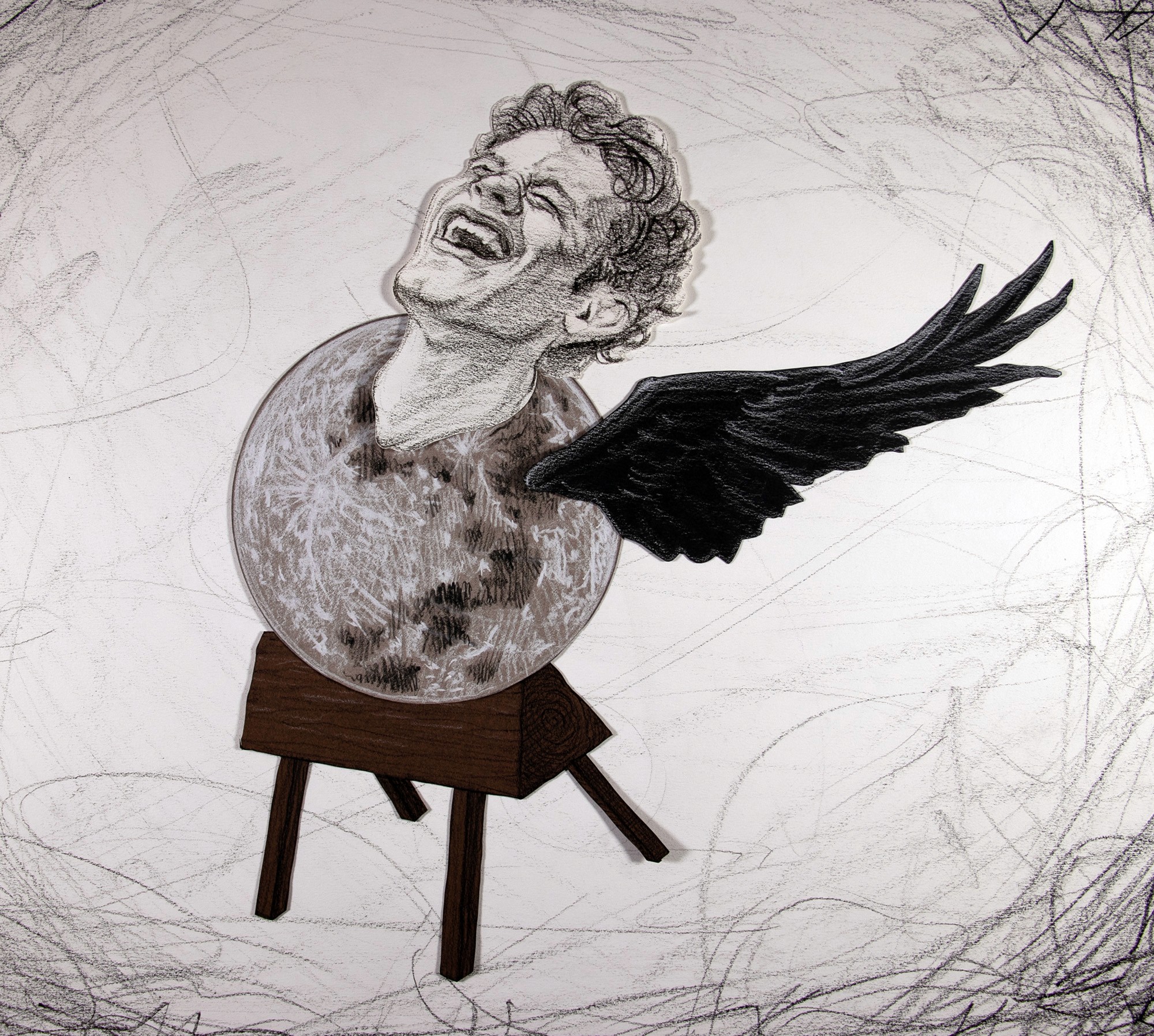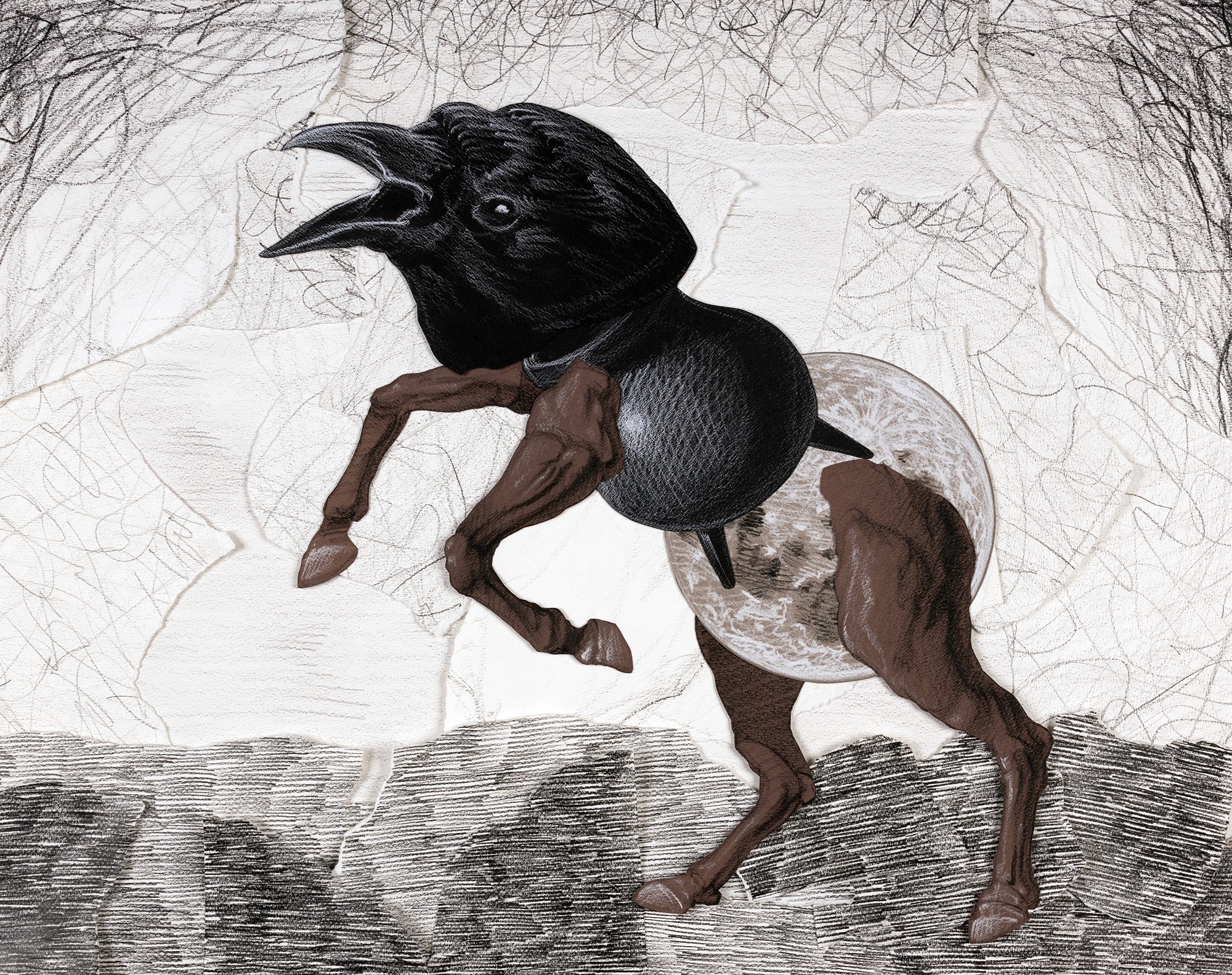 I begin by shaping paper into spontaneous, irregular forms. I search these shapes for any suggestion of figures or creatures. When something emerges, I draw it—not as paper, but as a living entity implied by the form. Most paper shapes reveal nothing, but a few contain surprisingly vivid potential.